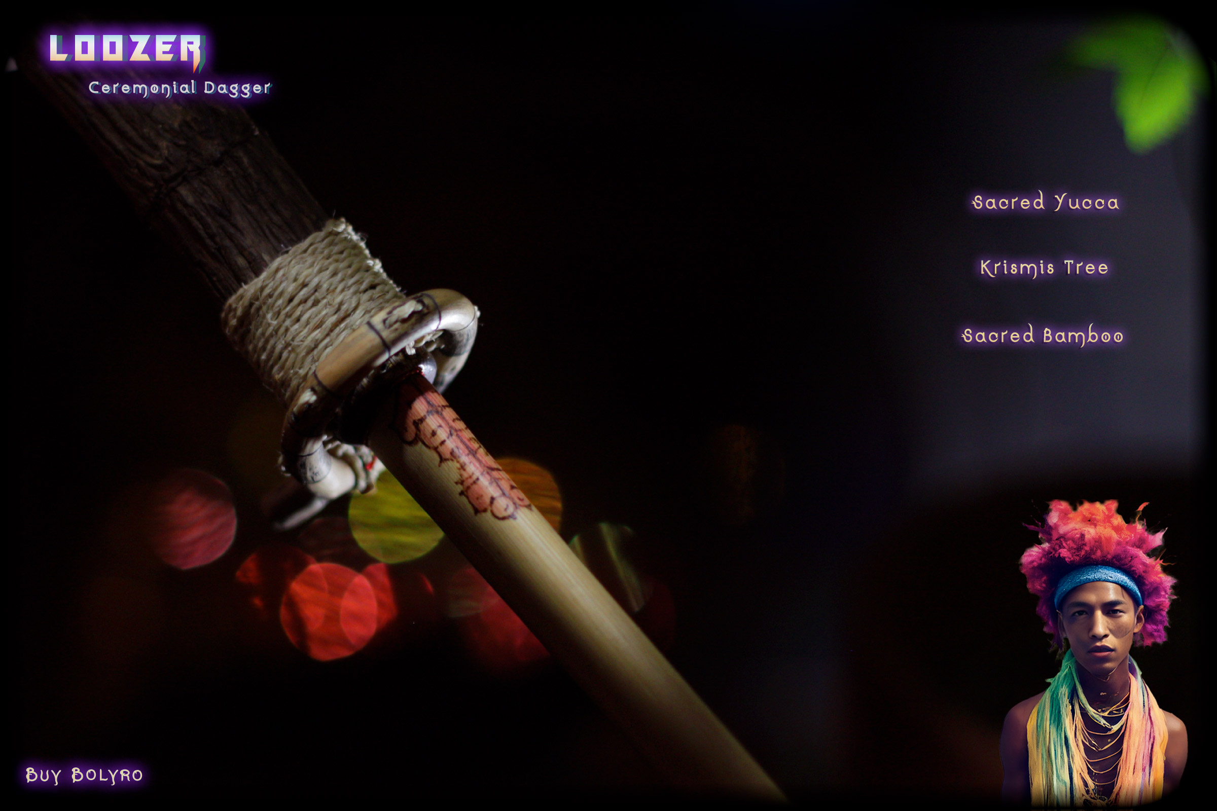 Sacred Bambu, Osage Orange, Hard Maple, Krismis Tree, Pecan, Sacred Yucca, Grass, Barktan Sheepskin, Barktan Cowhide, Barktan Deerskin, 24 Karat Gold, Cotton, Linen, Salt, Oil Paint, Shellac.